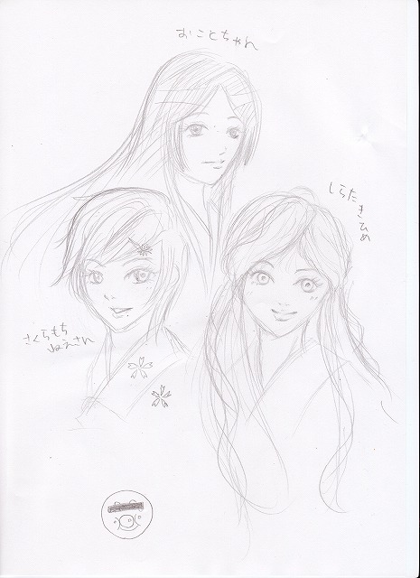 女の子描けて楽しかったです。鉛筆描きですが・・・薄くて見にくいかな;;なんか勢いだけで描いた感じ^^;元の姿はどっかで探して見てくださいねおことちゃんさくらもちねえさん しらたきひめです。 着物の女の子描くのは大好きです。着物の柄を考えるのも大好きです。着物を着るのもかなり大好きです。着物の絵描きたいな~暇が出来たら描きます。にしても今日はいい天気ですな~後で子供連れて散歩行きます。早く一緒に歩いてお散歩できるようになるといいな。頑張れmy息子。
