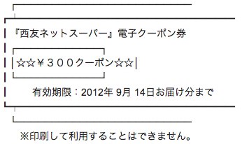 先日はじめて利用したせいか、西友ネットスーパーから300円分の電子クーポンが送られてきたでも、今日届いて14日配達までの注文にしか使えないらしい...有効期間48時間もない5,000円以上の注文じゃないと500円の送料がかかるし、この金額のクーポンじゃイマイチ有難み無いな〜有効期間を一週間くらい迄延ばすか、クーポンの金額を送料に相当する500円くらい迄引き上げるかしてくれたら嬉しい。