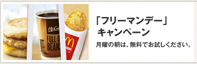 売上低迷や60秒キャンペーンで、このところネガティブな話題の多いMcDonald今度は朝6〜9:00に無料でソーセージマフィンやコーヒーを配るキャンペーンだそうです朝マックキャンペーン http://www.mcdonalds.co.jp/campaign/morning/index.html#freemondayコーヒーやハッシュポテトを配るのはありがちだけど、ソーセージマフィンは珍しいかも...今度の月曜がソーセージマフィンの日なので、早めに家を出て会社に行く前にマック覗いてみよう。相当混雑して、プアな雰囲気満載になる悪寒。