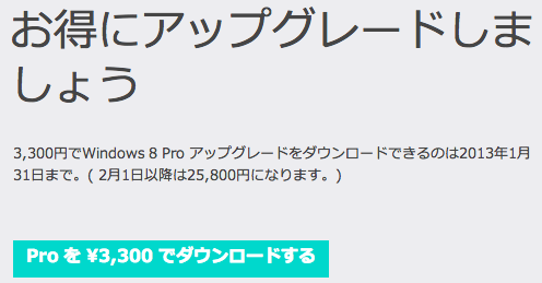 2月1日以降は、優待セール期間終了で22,000円以上値上がりしちゃいます。http://windows.microsoft.com/ja-JP/windows/buy?ocid=GA8_O_WOL_Hero_ShopHP_FPP_NullXpがインストールしてあるネットブックを、今更8へアップグレードしてもつまらない。7がインストールしてあるデスクトップは、買ってから2年以上たっても数時間しか起動してないし...いくら安くWindows8 をインストール出来ても、本当に必要性を感じた時に入手すれば良い気もする悩ましい問題です。