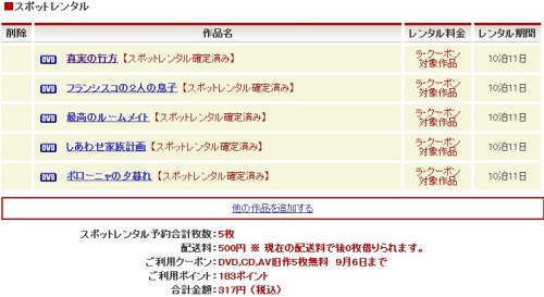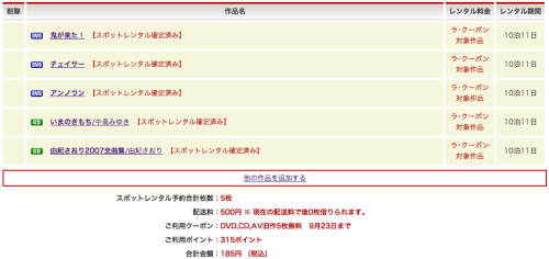 昨晩注文したレンタルDVDを発送したという連絡メールが届いた。受け取れるのは土曜日頃だろうか...そう言えば、楽天レンタルからも5枚迄の無料クーポンが届いていたただし楽天レンタルはレンタル料がクーポン適用で無料になっても、別途送料が400円位かかるから注意が必要だ。それに、「ぽすれん」で3枚借りた上に調子こいて「楽天レンタル」で4〜5枚借りたら、観る時間が捻出できるはずない。2日連続で徹夜しなきゃならなそう。一応、奥さんとお嬢に借りたいDVDがあるか聞いてみようかな〜