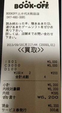 昼過ぎには台風も通過したので、近所のBOOKOFFへ買取してもらうために古いスマホと携帯を持ち込んだ。auのIS01とdocomoのT-01A、それからSoftBankモバイルのコドモバイル2台予定通り、6,200円になりましたそれから300円分のクーポンが付いてきて、当日から使えるとのことで久しぶりに古本も購入。100円本ばかりだけど、なかなか良さげな本が見つけられたと思います。イロイロありがとう>BOOKOFF!