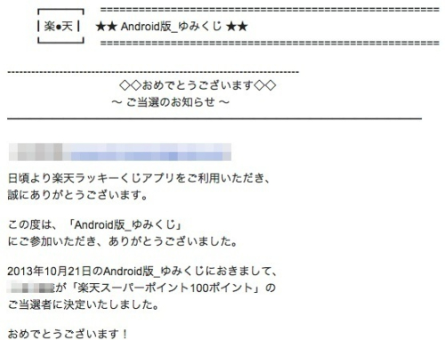 1日に2回出来る楽天のくじiPhoneだと「おみくじ」と「カニ釣り」だけど、Android版では「おみくじ」と「ゆみくじ」だ。わざわざサイトにアクセスしてくじを引かせるんだから1.2ポイント無条件で配布したってバチは当たらないと思うけど、楽天はそう思わないらしく当たるのは週に1,2回の頻度。先日からメイン使用始めたNexus7で何気にゆみくじを引いたら、なんと100ポイントが当たった全国で何千人?が毎日コツコツとくじ引きしているのか分からないけど、100ポイント当たるのは10人だけらしいので、なかなか珍しい。当たると、直ぐにメールでこんなコメントが届くので記念にアップしてみた。なんだか、つまらないことに幸運を使ってしまった気がしないでもない(100ポイント当たるのは100人じゃなく10人らしいので本文修正しました)