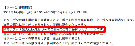 今まではだいたい週二回ペースで届き、とても有り難く使わせてもらっていたんですが注意書きでハッキリ「はじめて」の利用に限るとあるし、試しに使ってみたら「無効なコード」云々でエラーになったからもうダメですね。別メールで、kobo glo端末が4,980円で買える3,000円引きクーポンも届いていたけど、もう割引クーポンが使えないのに誰がKobo端末なんか買うかって感じです。どうせ買うなら、やっぱり3,000円引キャンペー中の「Kindle3G」 でしょう。