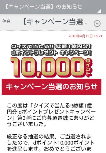 何かのキャンペーンで、dポイントが10,000ポイント当たったみたい。応募したのも覚えていないがdocomoでスマホを購入した時に「dカードGold」を作ったのだけど、確かにドンドンdポイントが貯まる。一応Goldカードなので10,000円の年会費がかかるが、docomoと契約している限り保有しても損は無さそう。因みに、1dポイント=1円の価値らしいから、1万円当たったようなものらしい。クジ運は良くない方だし、dポイント使ったこともないから、あまり嬉しさは実感できない。