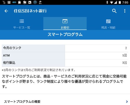 ランクアップするために、先々月米ドルを少額購入したお陰でランク1から2へランクアップしたこれで「スマートプログラム」が始まる以前の無料で出来るATM出金と振込回数に並んだ。因みに、先月から住信SBIネット銀行を給与振込先に指定しているので、5月からはランク3になる筈。月に7回もATMの出金手数料や振込手数料が無料になればもう充分
