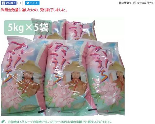 10000円の「ふるさと納税」でお米が25kgも貰えるのはここくらいだから、相当の競争率だった感じ今日の14時頃から受付開始とサイトに告知されていたので、仕事の合間に結構頻繁にチェックしていたけど、一向に始まらない。家に帰って念のためサイトをチェックしたら、もう終了だもしかすると、予定通り申込スタートしたところ数分で予定数量まで申込が殺到し受付終了してしまったのかも知れない。なんとも皆さん凄まじい情熱をお持ちで、些か背筋が寒くなる思いがあります