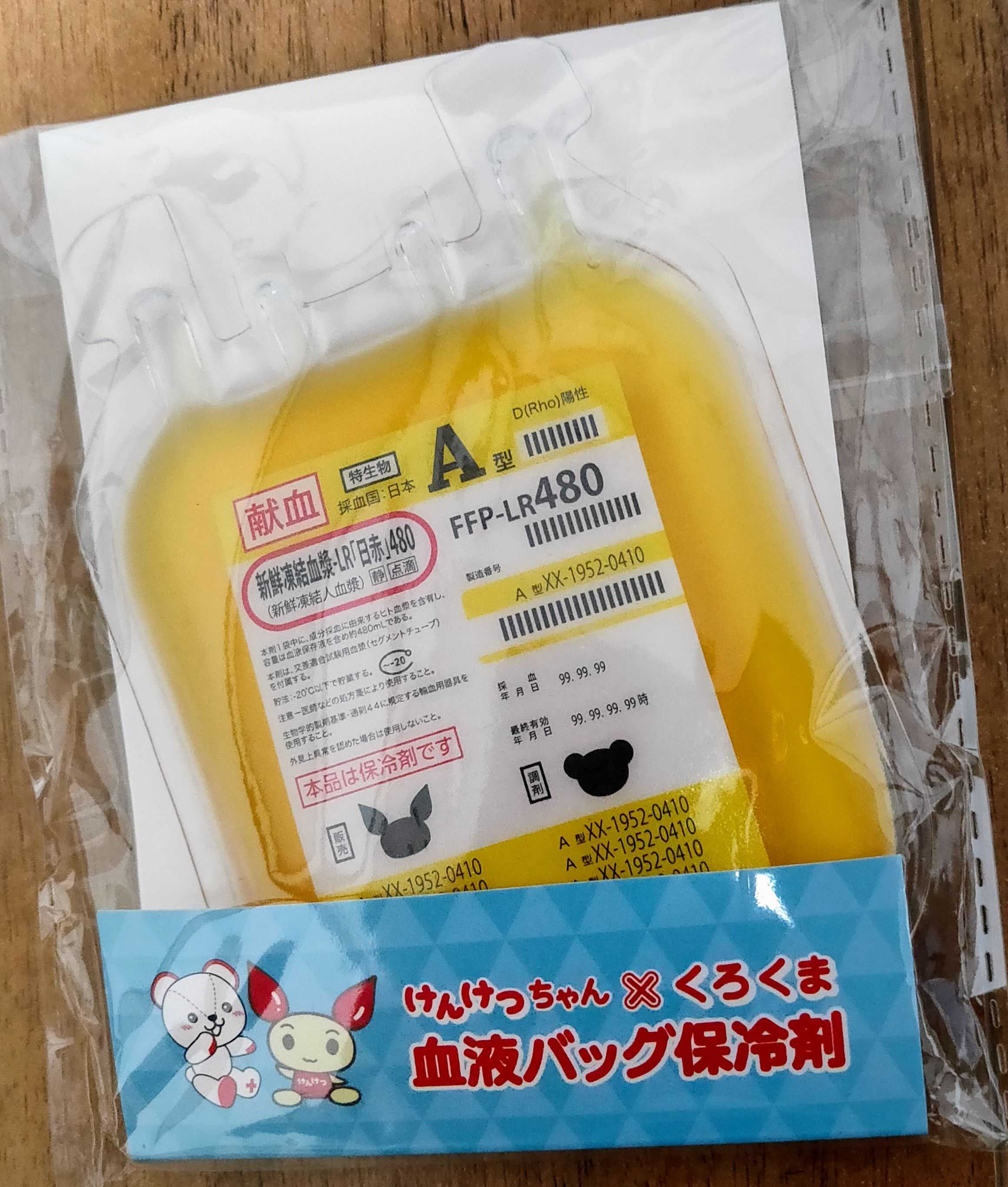 毎月恒例の献血...ここ1年ほど血圧が高めに出てるのが気にはなるけど、お歳であるから「当たり前〜」と自己肯定献血続けていると地味にポイントが貯まり、数回毎に粗品プレゼントが貰える。5年くらい前迄は粗品ながらそれなりに予算をとっていたのか、意外と面白く思えるプレゼントもあったけど、最近は地味ですちょっと前に、血液パックを模した保冷剤がリアルで話題になっていると何処かで読んだから、ちょっと期待していたら、期待通り献血後のプレゼントで選ぶことが出来ました。まぁ、確かにリアルではあるものの、実際に手にすると、かなり小さ手のひらに収まる程度の大きさで、厚みも1cmありません。実際の血液パックはパンパンに膨れて丸々しちゃってますからリアリティに欠けますね。中の保冷液の色はよく似ているけど(ただし成分献血の場合)