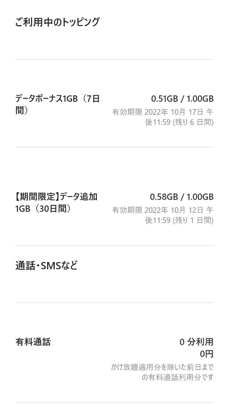 povo2.0で30日間1GBのデータトッピング済み。間もなく使用期限だから、無理して屋外で0.4GBほど消費した。ちょうどpovo2.0一周年キャンペーンで1GBプレゼントコードも期限間近だったから、昨日アクティベートした。有効期間は1週間。もうすぐ有効期限を迎える1GB中の残り0.6GBと1GBが合計されて、1.6GBほど使えるのだけど...なぜか、有効期限間近の0.6GBはそのまま、キャンペーンでもらった期限まで余裕のある1GBの方から消費されてしまうまぁ、どうせ無料でもらったプレゼントのギガだし、屋外でデータ通信あまりしないから持て余しているところもあるのだけど、有効期限が違うギガがあったら普通は期限が近いギガから消費されるものだと思うけど...サイトのどこかにギガ消費の優先順位みたい記述があるんでしょうかね〜