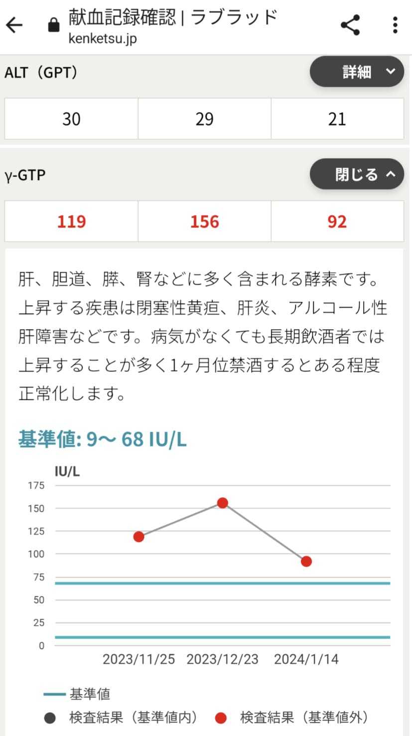 先日行った「献血初め」の簡単な検査が届いた。γGTP値が悪いから「食事を見直し運動を心掛けるしか無いなぁ〜」と思いながらも、何もしていないから、同じような数値で凹むと思っていたけど...なぜか改善していて、理由もなく気分良くなったまぁ、理由がないからすぐ元に戻っちゃうだろうし、改善したと言ってもまだ基準外であることに変わりはないしな