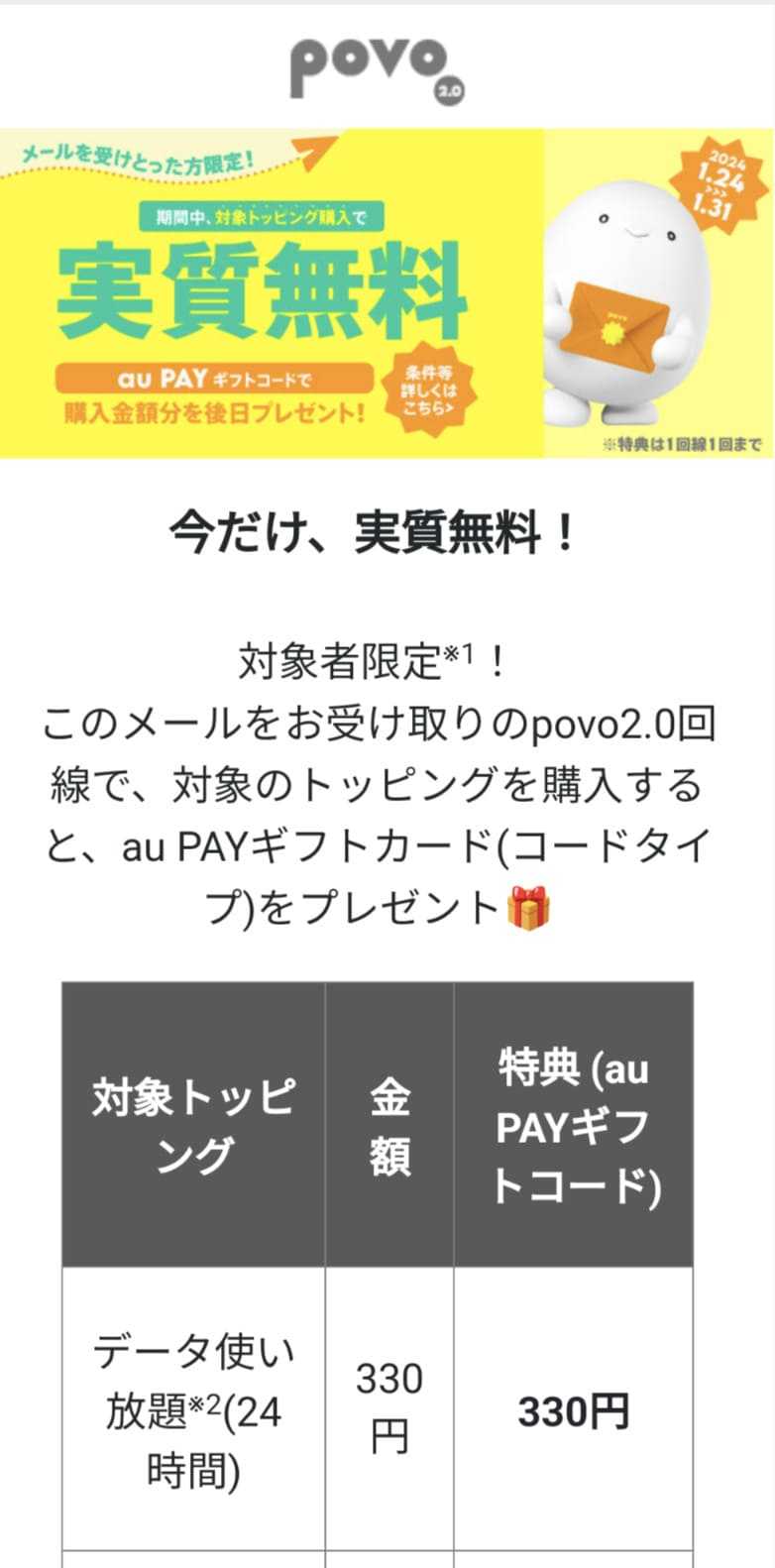 90日以上使っていないpovoから、また回線解約の脅しメールをいただいた。回線は維持したいから、大抵330円を払って「24時間データ使い放題」トッピングを購入しているのだけど、今回はちょうど良い具合にauPAYギフトカードのプレゼントキャンペーンとベストマッチ!多分キャンペーン適用になる筈だから、後日メールか何かで送られてくる筈のauPAYギフトカードコードを見逃さないようにしないと