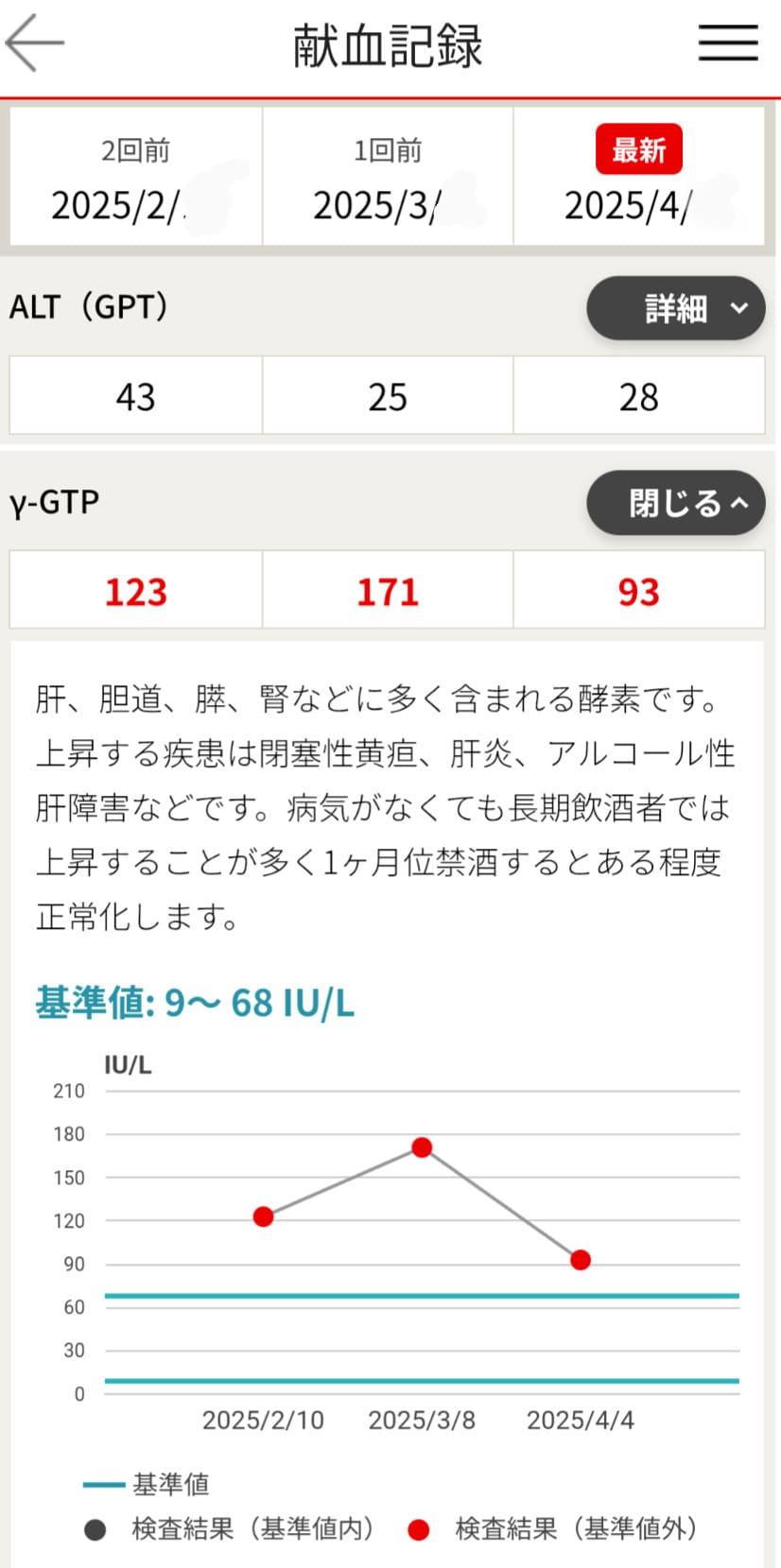 昨日済ませた献血の検査レポートいつも基準値外のγ-GTP、今回も多少改善するものの安定の域外マジ体重を減らさなきゃ基準値内へ戻らない気がする。ひと月前の献血から体重を2kg減らすつもり...実際はむしろ増加してしまったそう言えば、去年の3月頃70kgをつけて反省、一時は66kgまで落としたものの、結局元通り間食は減らず、一時変になった味覚も気づけば元通りで何を食べても美味しい今日このごろ体重60kg前半に減らすなんて、夢のような話です。