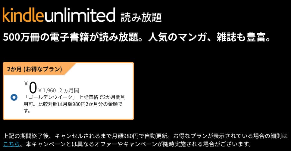半年ほど前にも無料キャンペーン利用させていただいたのに3ヶ月無料でkindle Unlimitedを利用できるキャンペーンも参加したことあるけど、今回は2ヶ月間のオファー...それでも有り難いこと5/6迄に忘れずに参加しないと!キャンペーン細則に、「過去12ヶ月以内にキャンペーン参加していない」とあるけど、オファー来てるのだから大丈夫な筈