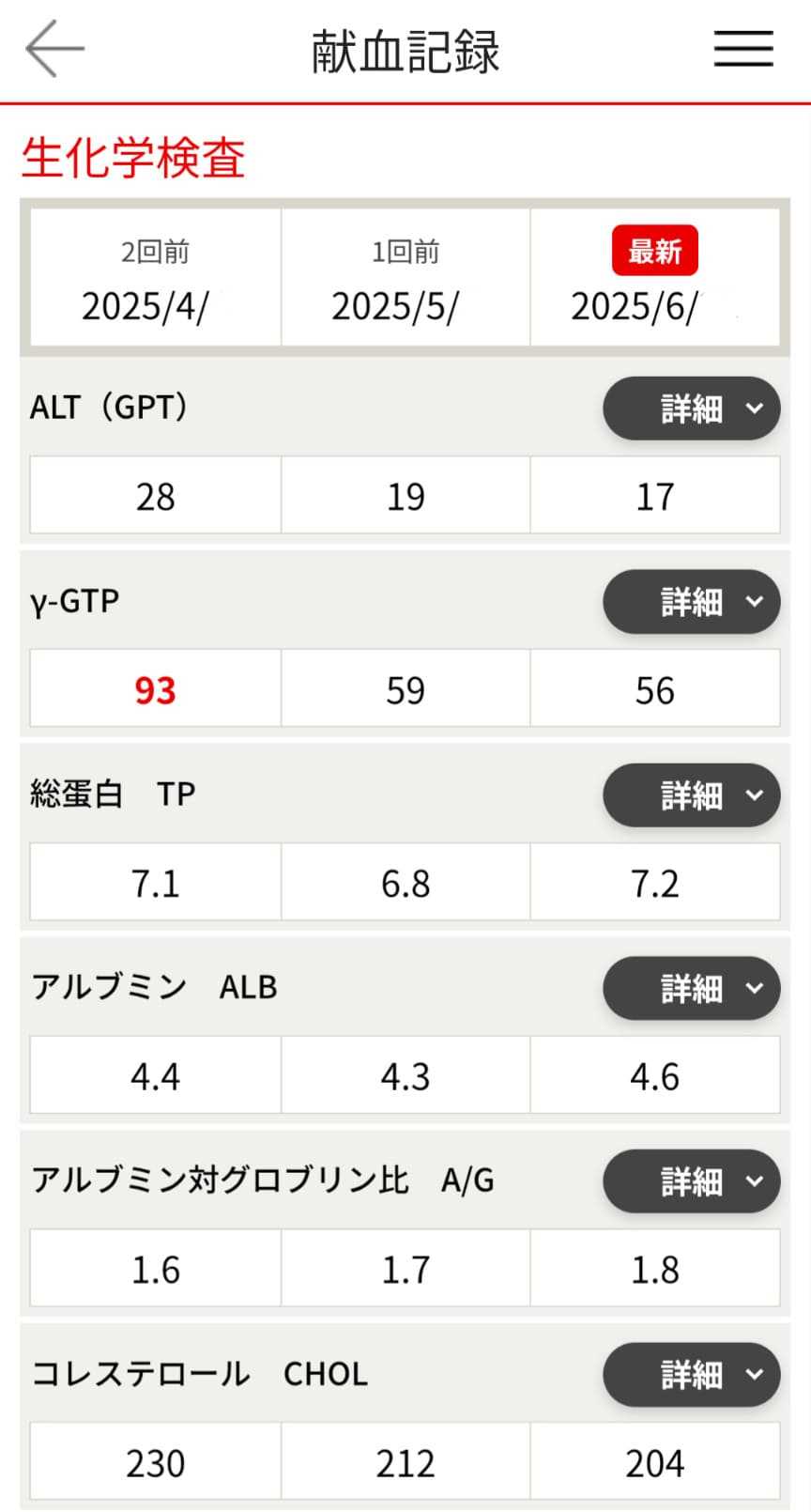飼い猫に引っ掻かれて延期した6月の献血検査結果運動とかなにも足掻かず、好きなだけ食べているから体重は70kg前後がデフォになってる今日この頃体重多めなのに、ALTやγ-GTPは基準値内で安定してるのがうれしい。白血球数と血小板数が安定して基準値下限ギリギリなのはあまり気分良くない。来月の献血も頑張る!?