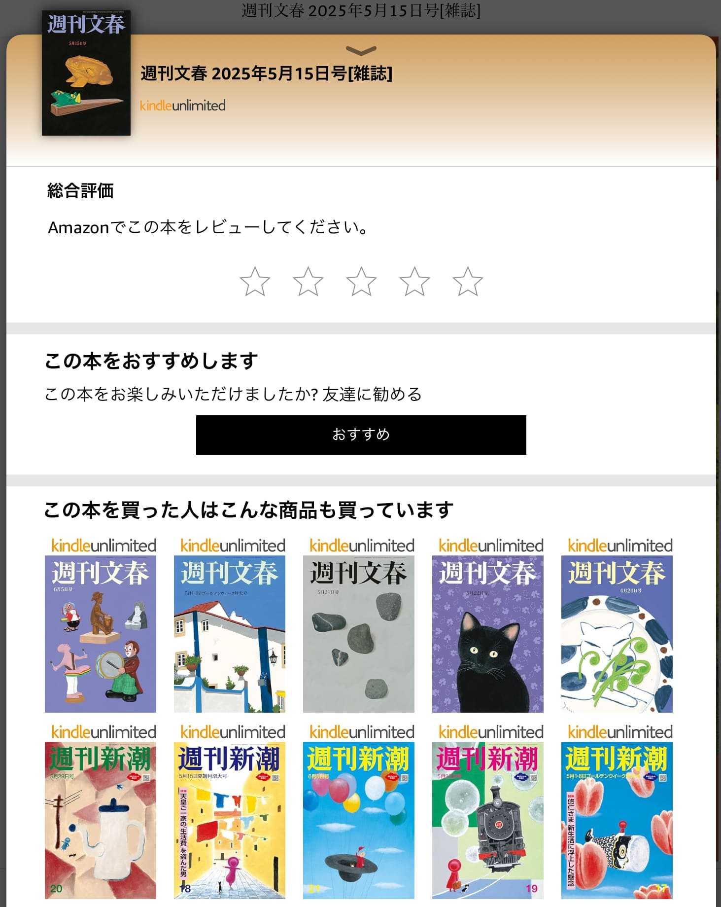 Kindle unlimitedで読めて当たり前だと思っていた「週刊文春」最近になってやっと読めるようになったらしい「週刊新潮」は以前からKindle unlimitedで読めた筈電子版でも1冊500円くらいするから、毎週買って読むような人がいるなら、月990円のKindle unlimitedは本当にお得だろう。ただKindle unlimitedで改めて週刊誌を読んでみたけど、なんだか面白くなかった電子書籍もイマイチ読み応えが無いけれど、電子版の雑誌は尚更その感が強い。雑誌が売れなくなっているのも何となく実感する。