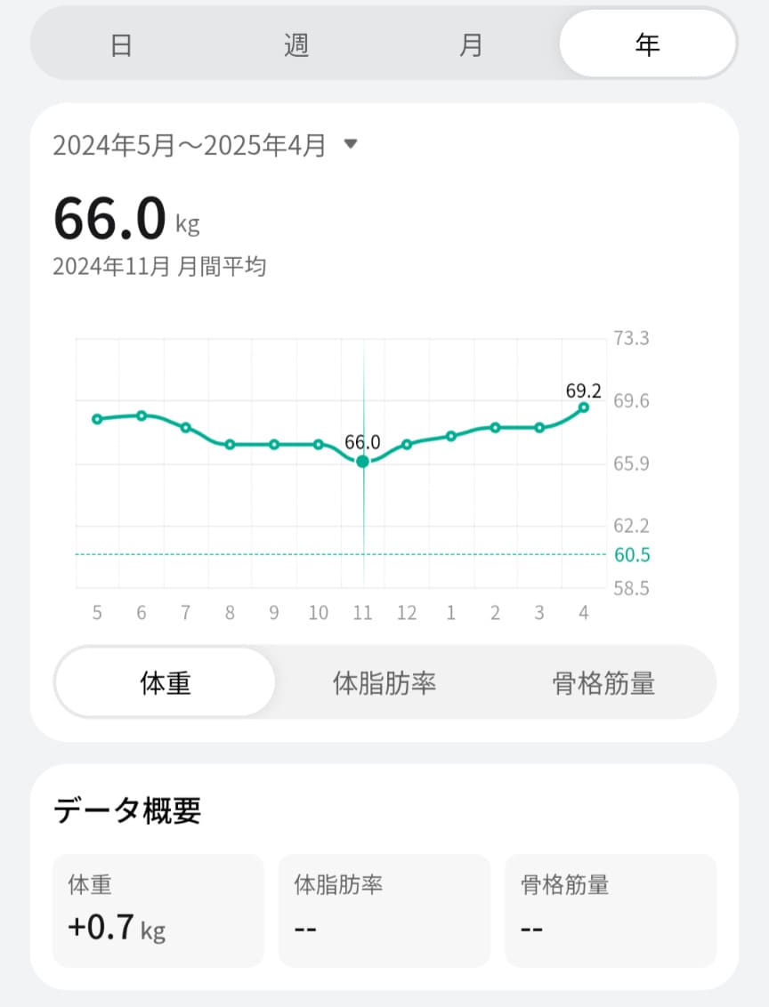 そう言えば、去年の3月頃70kgをつけて反省、一時は66kgまで落としたものの、結局元通り