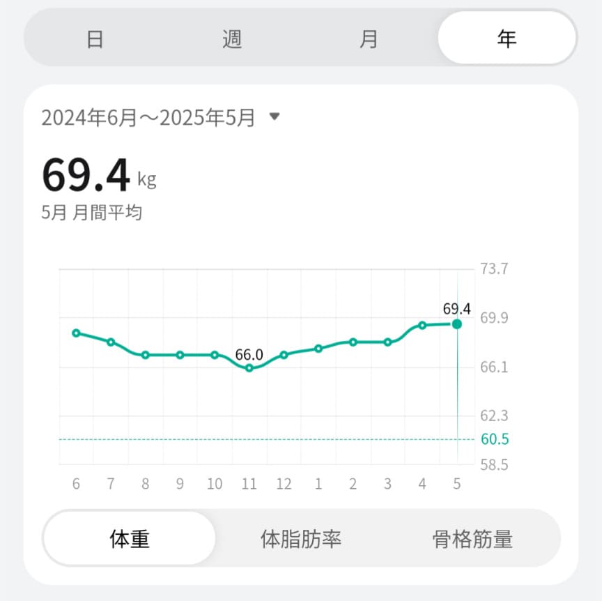 ここ1、2ヶ月は自宅で体重をはかるようにしているけど、面倒だったから長らく毎月の献血時の体重を記録して一喜一憂していた。