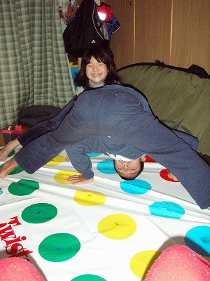木曜日も雨・・・金曜日も雨・・・今日も雨・・・しっかしよく降る雨だなぁ・・・。さっきやっと止んだかと思ったら、また降り出してきた・・・。子供たちも退屈してる。宿題も終わった、月曜日の準備も終わった。部屋の片付けも終わった。な~んにもする事がないと嘆いてる。 我が家はここ1~2ヶ月、テレビゲーム、DS、一切禁止。何故なら、やることやらずにゲームに熱中していたからだ。 ゲームが出来ないと娘はマンガを描いて遊んでる。息子はマンガを読んでいる・・・。はぁ・・・偉人伝記とか読めばいいのに・・・。(って私も読まないから無理ないか!)外に遊びに行けないなら行けないで、家の中で仲良く遊べる事はないかと考えて思いついたのがこれ!↓Twister!懐かしい遊び(^^)色の付いた円盤のようなものを回して色を決めてそこに手や足をおいていくというもの。ありえないポーズで子供達は「ヨガだ!」「ヨガだ!」と喜んでやっている。画像で見えるかどうかわからないけれどオリジナルで番号を書いている。その番号にすばやく足を運ぶという遊びもやってた。 子供って、一つのものから色んな遊びが出来るんだよね。 そこから学んでいくものがたっくさんあると思う。 あるリトミックの先生に会った時こうおっしゃってた。「最近の子供達は、創造力に欠けている。はい、じゃぁ、みんなでゾウさんになりましょう~!と言うとこぞってみんながみんな、腕を伸ばし、鼻に見立ててゆっくり歩く事をするんだよ。象は四足だから四つんばいになってもよさそうなのに。歩かずとも鼻で果物食べたりとかするでしょ、腕を伸ばすなら食べ物を食べる動作とかあるのに、歩いてしまう。象じゃなくても、キリンと言えば「?」と皆が固まり、一人の子が両腕を上げて歩き出したらみんながそれを真似てしまう。自分で考え、想像する力が欠けて来たんだよね~」・・と。 小さい子供に限らず息子たちのように大きくなっても「自分たちで考える」と言う力が足りない。 息子がまだ小学校低学年の時に私によく言っていた事。それは「僕、何したらいい?」 私の小さい頃は、決してお小遣いを沢山貰ってたとか(むしろお小遣いとか無かったし)おもちゃを沢山持ってたと言う訳じゃない。どちらかと言うと、おともだちの家に行っていくつかの玩具があるのを見て羨ましがっていた方だった。それでも、遊びたくて遊びたくて、やりたい事がたくさんあって、時間が足りずに門限を過ぎてしまってよく叱られたものだけどなぁ・・・。親に「何したらいいか?」なんて聞いたことがなかった。 人間は物質的に恵まれていない方が、よく遊び、よく眠れるのかもしれない。
