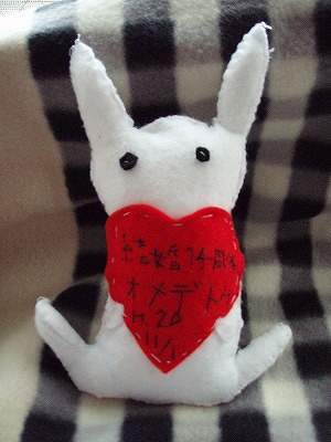 11月1日は、私達の結婚記念日でした。結婚15周年は水晶婚式なんだそうで・・・。 水晶なんて買ってもらってないよぉ~水晶どころか15周年まで毎年毎年それなりの婚式名があるみたいだけど何も別に・・・ちなみに14周年は、象牙婚式なんだそうな2年目なんて、藁だよワラ面白いね~! 毎年の結婚記念日は唐津神社祭の前日なのでもてなしの準備で忙しく今までお祝いなんてした事がなかったけど15年目にして初めて一番嬉しい結婚記念日になりました。それは31日のHRCで、何となく私が「今日はハロウィンのお祭りと、お母さん達の結婚15周年記念日と一緒のお祝いだからね」と何気なく言ったのをしっかり聞いていた娘が1日、朝から部屋に篭り、せっせ、せっせと背中を丸めて何か作ってる様子何やってるんだろ?と別に気にも止めてなかったんだけど夜になってこれ↑を私の所に持ってきて「お母さんお父さん、おめでとう♪」と言ってくれた・・・。 「今日は一生懸命これ作ってくれてたの?」「うん♪」 なんとまぁ、可愛いことする娘だこと・・・ もちろん息子に至っては「15周年」だと言っても「ふ~ん・・・で?」みたいな感じで全く興味無し・・・。 娘の手作りマスコット・・・。下手くそなんだけど、その気持ちが嬉しいよね 娘よ、ただひとつ惜しい!!14周年じゃなくて15周年なんだよね~・・・・・なぜ間違ったんだろ・・・