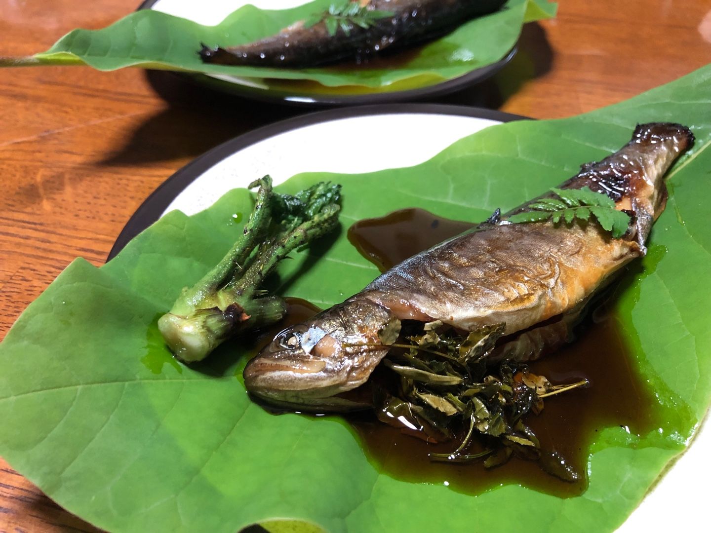 釣ってきた岩魚はすぐにさばいて、白焼きにして、そのあと山椒の花と新芽で甘露煮にします。