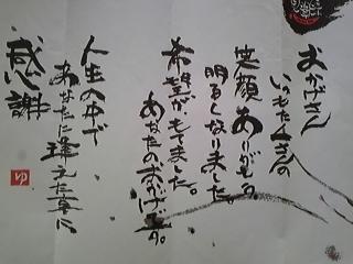 ☆ 戻ってきた年賀状 ☆ 今回は 年賀の挨拶をどうしようかと思いながら、ぎりぎりにだしてしまったこともあり 住所のチェックをちゃんとしないで出してしまいました。 その結果・・・ 戻ってきた年賀状が2枚あります。 昨年再婚されて名字も住所もかわっていたのに、 変更しないままだしてしまった のが1枚。 申し訳ないことをしてしまったと、反省しています。 戻ってきた二枚は、一枚は 愛媛県の新居浜市にいる中学時代からの文通を通して 知り合った友人へ送ったハガキ。 そして、もう1枚は 北海道札幌市に住んでいる 学生時代の友人へ送ったハガキ。 どちらも、転居していたんですよね・・・ わかっていたはずなのに、戻ってきたハガキを見て やってしまったあ・・・・と、反省しました。 送ったのも遅かったから、戻ってきたのも、 一月六日でした。 あわててもう一度送りましたが、 届いたかなあ・・・ こんなこといっちゃいけないんだけど、 実は 戻ってきたハガキに押されたはんこを 見て、 なんか感慨深かったんです。 どちらも、しっかり、札幌と、新居浜のはんこと 担当のかたのはんこが押してありました。 このハガキは、遠いところを往復してきてくれたんだというなんともいえない思いと、 いろんな方の手を煩わせてしまったという申し訳ない思いがわいてきました。 来年は ちゃんと目的地に届くようチェックをしっかりしてから、出したいと思います。 再婚した友人にも、 あらためて、おわびの言葉をそえて、賀状をおくりました。 〇 気持ちのきりかえ 〇 今年は 何事も ポジティブにいきたい だから、 いやだなと思うことも、 考え方を ちょっと変えて、自分が元気に なれるようにしていきたいと思っています。 私も、50代。 もう自由な時間をもててもいい感じもしますが、なかなか。 もちろん、やりたいことも、それなりにさせていただいています、出来ない人の ことを考えたら、十分幸せです。 先日、午後から用事があって出掛けたときの事。 四時半くらいに、携帯に電話 がはいりました。 義母からです。 「いつまで、なにやってんだか~? 」って、 怒った電話。 私は、用事を済ませて、買い物しての帰り足でした。 でかけてから、3時間くらいたったのかなあ。 ふ~、まだ、こんなふうに電話もらうんだ、私って 「まもなく着くよ~」といって、電話をきりました。 ま、仕方ないか・・・歳をとってくると、一人で、待ってるのが長く感じるのでしょうね。 待たれてるんだと、いいほうに解釈することにして、元気に帰りました。 「ごめんね~」と言ってね。 愚痴にかえてしまうと、 どんどん心が苦しくなってくるものね。 短い時間でも、出掛けられる自分はありがたい そう思います。 一つ、一つ そんなふうに、気持ちをきりかていったら、 楽しい毎日になるかな・・・ そう願います。 そんな自分になれたのも、 大切な人との出会いがあったから。 毎日感謝しています。 ずっと、歳したなんだけど、 私はいっぱい教えてもらって います。 元気にしてもらっています。 これからも、その出会いを大切にして いきたいと思っています。 居酒屋さんで、テーブルにしいてあった のを、なかなかいい言葉が書いてある と思って家の主人がいただいて きたそうです。 今の私の気持ちですね 出会った方たちに心から感謝 したいです。 笑顔は 幸せを運んでくれるそうです。 悲しい顔は 不幸が喜こぶそうです。 どんなにおちこんでいても、笑顔でいられるようにつとめたいです。 きっと、笑っていたら、 プラスのエネルギーがふえてくれるでしょうから 誰かが喜んでくれる事をできたら、私もうれしいな。 それが、幸せにつながる ような気がします。