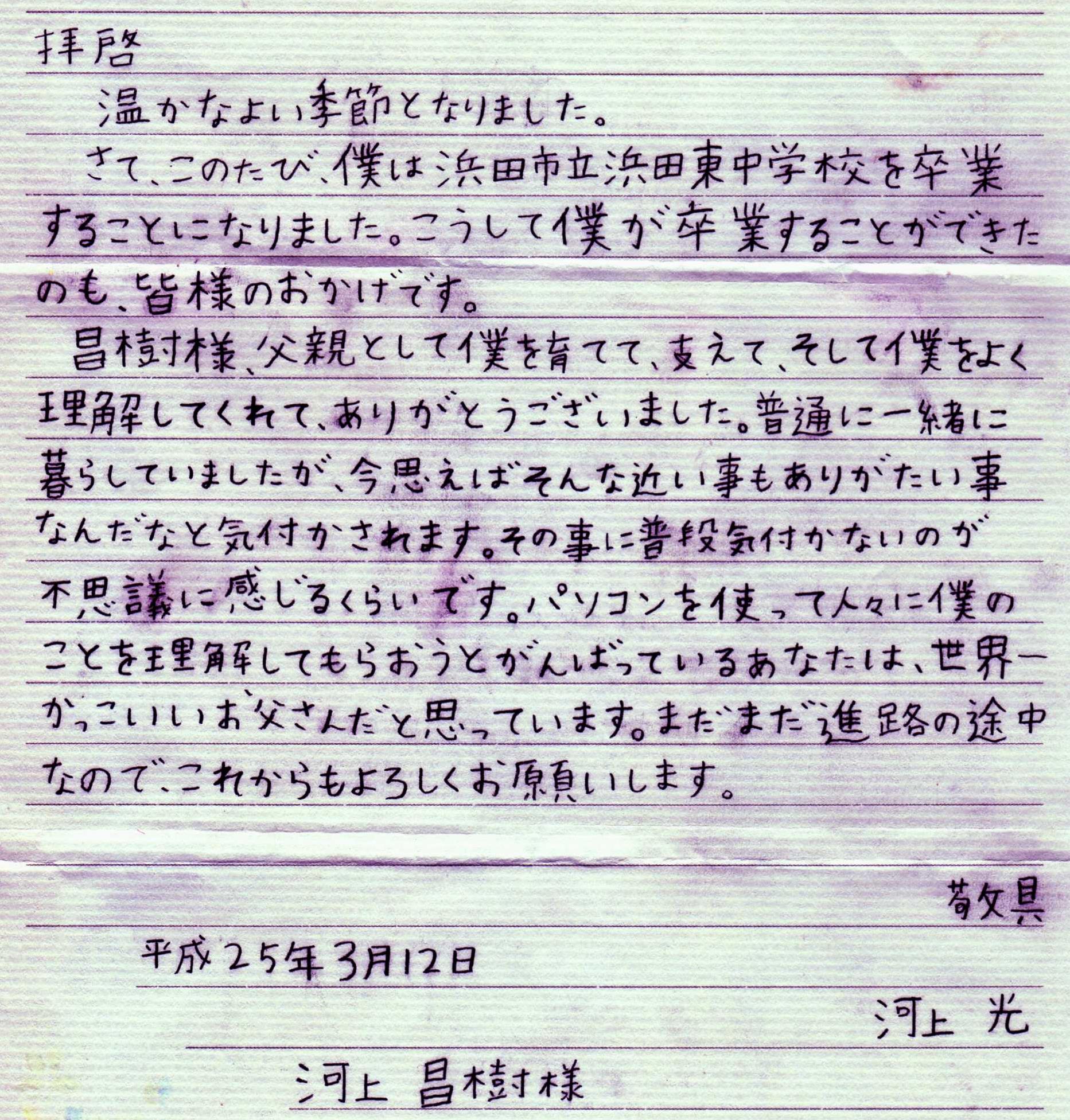 12年前、光からもらった手紙です。(^^♪ADHD脳で人生楽しんでます! 走って転んで、また走る [ あーさ ]価格:1430円(税込、送料無料) (2022/11/15時点)楽天で購入自閉症の僕の七転び八起き (角川文庫) [ 東田 直樹 ]楽天で購入 facebookもよろしく♪ ひいちゃんパパひいちゃん朗読 人権作品コンクール最優秀賞受賞 「ぼくの人生こんぺいとう」「光への手紙」 作詞 : ひいちゃんパパ 作曲・歌 : 人力車さん「ひいちゃんにっき」の本を希望される方や、個人的にメッセージを送りたい方は、yachiyo@crocus.ocn.ne.jpから、「ひいちゃんパパへ」というタイトルでメールを送ってください。それ以外だと、削除してしまうおそれがあります。
