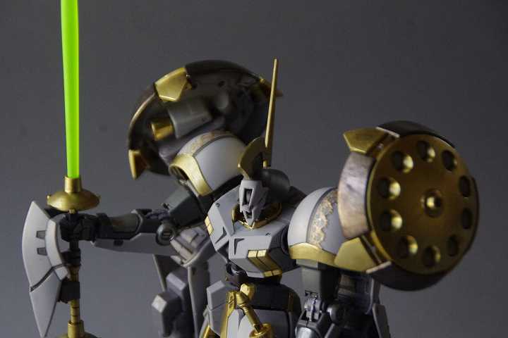 プレミアムバンダイのドズル専用ドム風を狙って、肩アーマー・腰アーマー・サーベルの鞘に金モールを張っていますが、分かりにくい写真です