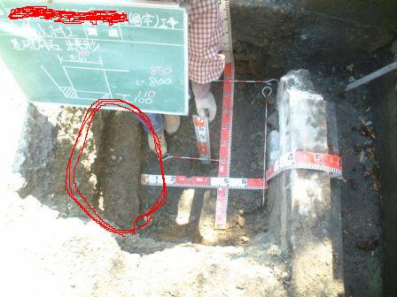 赤で囲んである部分はNTTの光ケーブル。これを切断しようものなら会社は飛ぶ。いろんな企業からの損害賠償請求がきてしまう。最短で復旧しても最低約4000万円の補償額だとか・・・。ケタが違う。この写真は土被りが60センチしかなく補強をかねて補巻コンクリートを施工してある。それだけ重要なケーブルだとか。とにかくこのケーブルは海底を通って沖縄や世界各国へつながっているとのこと。わかりました?私もちゃんと仕事やってます。(NTTじゃないですよ土木です)