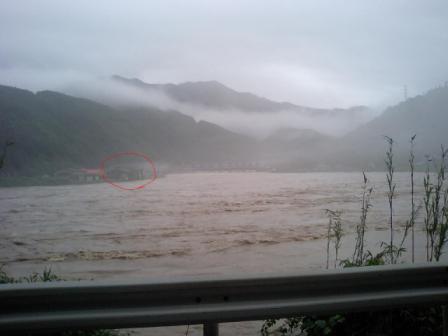 球磨川洪水です。ちなみに下の写真の赤丸でくくってある部分は八代東高の分校です。分校自体数十年前に廃校になっていて体育館しか残ってませんが。そして体育館の以前の洪水で傾いたままです。 ↓このように国道も冠水中です↓↓この中に入ったら八代までいけます↓