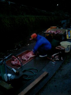 写メは昨日の夜従業員の人の家に行った時に出くわした様子。いのししの解体ショーが開催されていた。