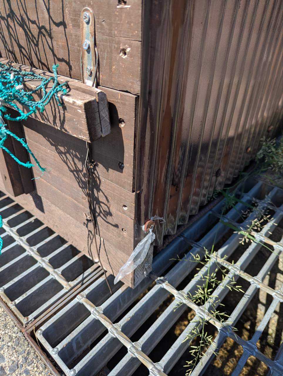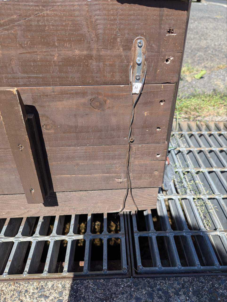 グレーチングに針金(太いもの)でゴミ箱が移動しないように括り付けました。
