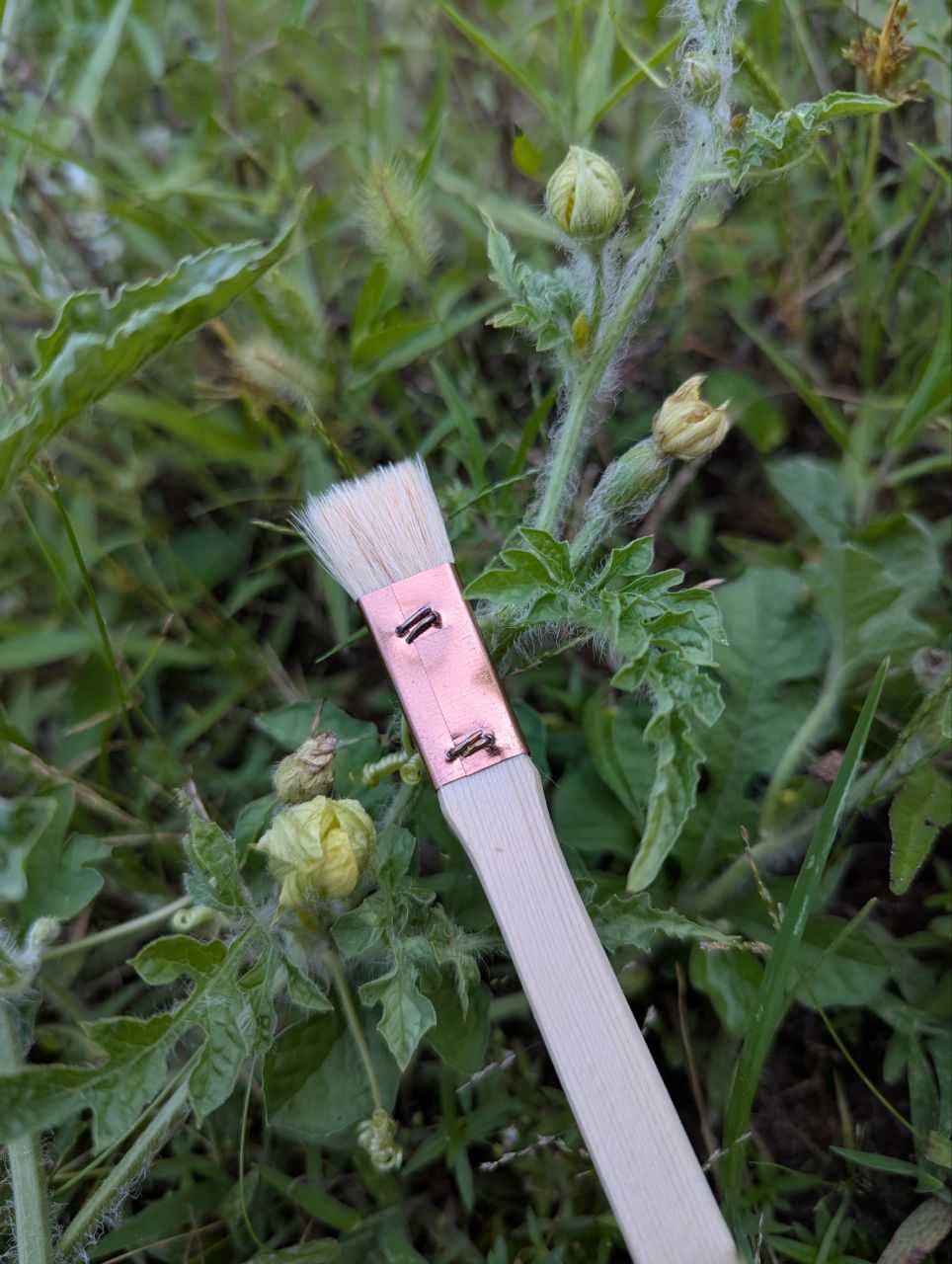 そこにおしべの花粉を筆でこすり取り、めしべに受粉させてみました。