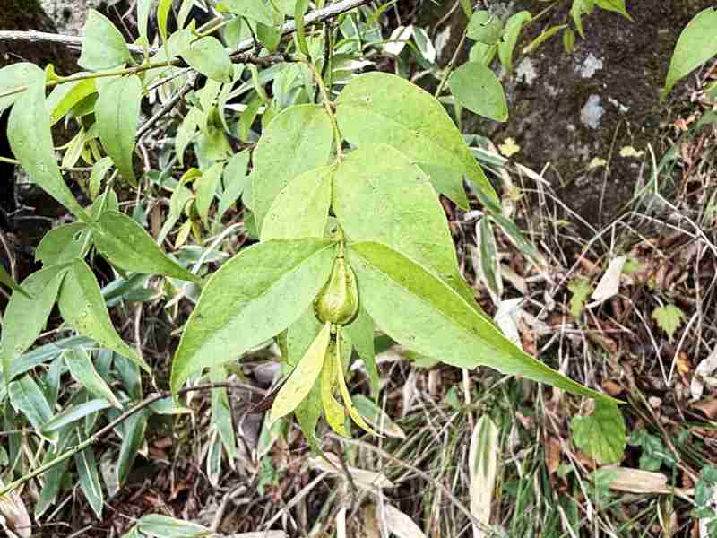 ホソバノツルリンドウ(細葉の蔓竜胆)リンドウ科ホソバノツルリンドウ属の多年草のつる性植物環境省絶滅危惧ll類(VU)北海道、本州、四国の山地から亜高山帯の林縁や薮、道路の法面に稀に生育。ツルリンドウに似ているが、全体に細く、葉が狭い。ツルリンドウは花冠が5裂して副片があり、ホソバノツルリンドウは花冠は4裂で副片がない。
