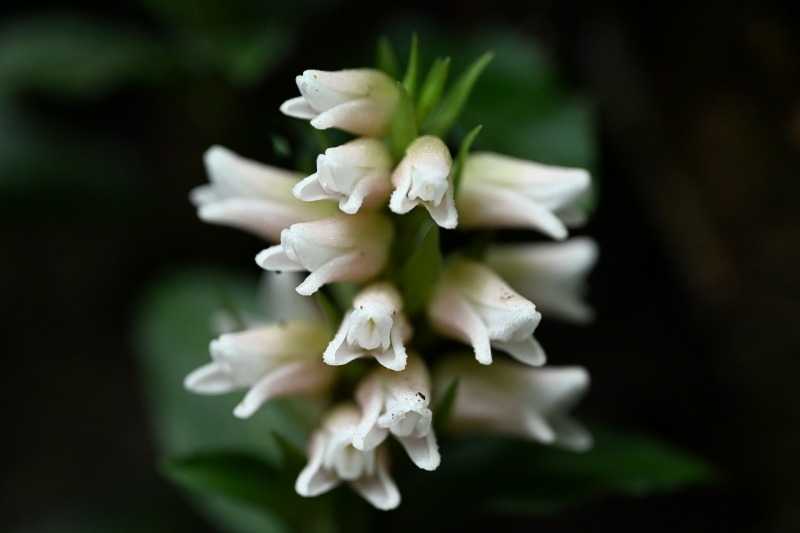 アケボノシュスラン(曙繻子蘭)ラン科シュスラン属の多年草葉の色と感じが織物の繻子に似ていることから付けられたシュスランに似て、花が夜明けの空の色、曙の色にたとえたことが由来緑がかっている背萼片シロバナ