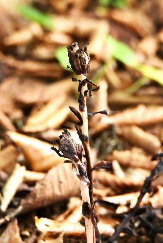 マヤラン(摩耶蘭)ラン科シュンラン属花茎は葉緑素を持つが葉を持たないので、菌類と共生して栄養を得ている菌従属栄養植物環境省絶滅危惧ll類(VU)神戸の摩耶山で発見されたのが由来6月後半~7月前半に一度花を咲かせて枯れ、秋にもう一度花茎を出して花を咲かせます。