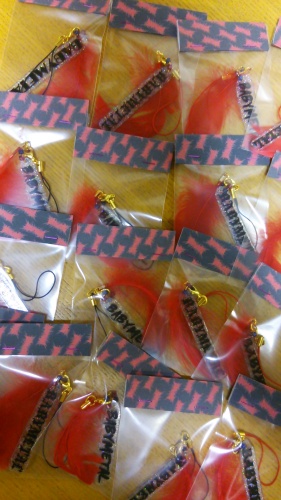 ベビメタストラップとりあえず量産してみようかとロゴ書きおかんのポーチ類半分ほど値付けしてボックスに置いてきたちょっと停滞してたしこれで売れるかなでも明日から雨らしい(>_