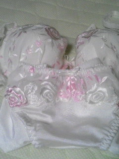 今週の頭に届いた分ですが、こちらの商品が届いたのでネタバレです~。また再販を開始したみたいなので、買い逃した方はチャンスですよ~!私は前の分と合わせて8セットも買ったので、今回はパスです。こんなに下着買ったら親に怒られるよ…トホ(幾つだよ)じゃ、ネタバレいきまーす!カワイイーーー!白!刺繍もキレイですね!白は初めて入ってたので、嬉しいな~。続いて…ピンクーーー!!そしてイマージュ来たーーー!!結局トリンプとは出会いが無かったけど、イマージュの方がカワイイので、オッケー!そして最後は…かぶっちたーーーーー!!アハーーーン!!でも、この色気に入ってるので、これもオッケーー!そんな訳で、おまけも頂きました。お花のブラストラップ。これはキャミを着るようになったら付けようかな~。あと、レビューを書いた時に無料でもらえるキャミorタックトップですが私にはこちらが届きました。ピンクっぽく見えますがベージュのサテンっぽい生地です。親には好評(笑)。でも裾がフリフリしててカワエエです。無料でこんなの貰えるなんて太っ腹だな~。あ~折角再販してるんだから、買いたいけど~~下着用の引き出しがパンパンだよーーー!もう入りませーーーん!!あ、あと同じお店の共同購入で買ったパンツ1枚190円!5枚買ったんですがこちらの写真もドン!ちょっと見にくくてすみません。もっと派手派手でもよかったんだけど、意外と無難な色と柄です。1枚黄色のパンツで化粧品の刺繍が入ってるのがあるんですが(写真左上)それは凝っててカワイイ☆お気に入り。あとはピンクや黒で少し刺繍が入ってる感じでした。もっと派手なのが届いてる人とかいるのかな~。こちらもまた再販で共同購入が始まったので興味のある方どうぞ~!!