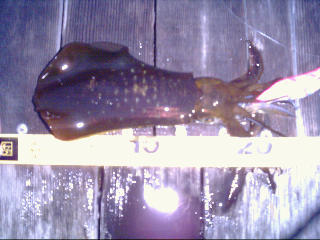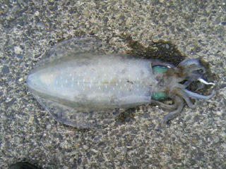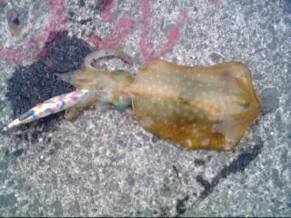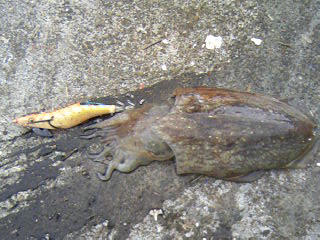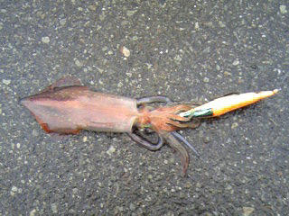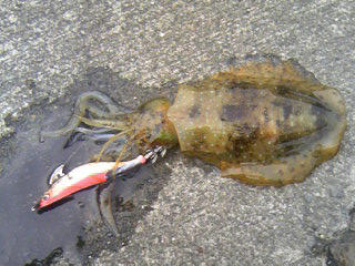 皆さんこんにちは~昨日も仕事が無く暇になってしまい釣りに行ってきました!最初はジギングをやろうと思い目的地のサーフに到着!遠投カゴ釣り師1名。声を掛けて情報を聞きますと全然アタリも無いよ・・・との事でも折角だからと思い先日買ったジギングロッドに40gのジグを付けての第1投!!うぉ~!!めちゃ飛ぶ!!100mぐらい飛んで行った感じ1時間ぐらいやりましたがアタリ全くありません日中はダメか?(笑)その後、エギングをやろうと場所移動!天気も良くあぢ~~最初の場所では全くアタリも無く次の場所へ!1時間ほどやってこの日初のアタリ!十分送ってからビシッ!乗りましたが軽い・・・300gの♀一応これで○ボ無しその30分後。ジャーク後のフォールで一気に引っ張るアタリ!即アワセビシッ!!か・・・軽い・・・350gの♀その後、夕方になりジギングにチェンジ!日没までやりましたがぜ~~んぜんアタリ無しです帰ろうか迷いましたが次の場所に行く事に!現着後、様子を見に何も持たずに堤防へ!先端にエサ釣り師1名。声を掛けて状況確認。さっきからシーバスがボイルしてるよとの事!マジ~~!車に戻ってジギングをセットし釣り開始!最初はジグで・・・その後ルアーを付けて・・・色々やってはみたもののアタリ無しエサ釣り師の方はネンブツダイを付けてブッ込みます。いきなりロッドが満月!!!が痛恨のバラシ・・・気合の入った僕はルアーを投げまくりますが全然アタリ無し・・・や~~めたエギングにチェンジ!30分ぐらいやっていたらアタリ!ステイ中にモソ~って感じでアワセ!ロッドには一瞬確実に重みは伝わりましたが・・・あれ?そのままフォール、ステイ・・・シャクリ・・・誘ってみましたがダメ・・・巻き上げたエギを見てみると太いゲソが1本付いてましたやっちゃった~~その約30分後!シャクリ後のテンションフォール中に今度はコツンって感じのアタリ!その後スーってロッドを持って行くのでビシッ!!!!ドラグがジーーーーーーー!!!!! デカイ!!これを待ってたんだ~~!ラインの出が止まったのでゆっくり巻き上げます!!寄せている間も抵抗してドラグがジー!ジー!慎重に寄せてやっと浮いてきた感じ!暗闇の中でビシュー!!ってジェット噴射!そのたびにドラグがジーーー!ジーーーー!手前に来た所でライトで照らしますが・・・ライトの明かり最大にしても、く・・暗いイカがしっかり見えません・・・電池交換しておけよ!!!自分に言い聞かせてますエサ釣り師の方もライトを照らしてくれますがこっちも暗い・・・電池交換しておけよ!!!エサ釣り師に言い聞かせますけっして口には出しませんが(爆)何とかイカの居る場所だけは解るので適当にこの辺かな??でギャフ撃ち!何とか引っ掛かってくれてゲット!!二人でいった(2キロ)か??!!まずは写真撮影。が!!!デジカメ持ってきてません最近携帯でしか撮ってないので・・・真っ暗の中取り合えず携帯のライトを付けてパチッ!映った画像真っ暗二人でライトを照らしてパチリ!でも真っ暗・・・・ガ~~ン!!!デジカメ持って来なかった自分が悪いですその後ドキドキしながら重量を量ります。いったか??いったか??目盛が止まった所は・・・1800g・・・あ~~!2キロ行かなかったでも自己記録更新ですその後0時過ぎまでやりましたがアオリからの反応は無くケンサキ2杯追加で納竿としました。帰りに港入口の常夜灯の下で何とか撮影!でも暗いな・・・この日の教訓!1.ライトの電池は常に交換しておけ!2.デジカメは常備しておけ!でした(爆)でも、今回自己記録が更新出来てめちゃ嬉しかった釣行になりましたポチッ!と応援クリックお願いします(^^) ↓ ↓