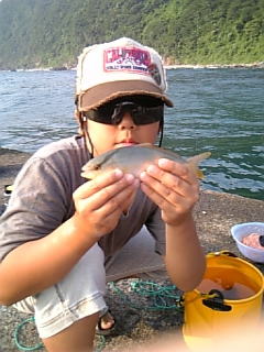 皆さんこんにちは~昨日は夕方から息子達と釣りに行ってきました。長男はブラックバスをやりたいと言い、次男は食べれる魚を釣りたいと言います・・・悩みましたが今回は次男の希望で海に決定!行きがけに釣具屋さんに寄ってサビキとオキアミを購入!現着してまずは長男の仕掛けの準備をし釣り開始!イワシ狙いでタナを浅くしてサビキをブチ込むと早速ウキが沈みます。上がってきたのはネンブツダイ5匹掛けその後もネンブツダイの攻撃が続きますその間に次男の仕掛けもセット完了!ネンブツダイを避けようと思い2本ともタナを深くします。そうすると長男の竿にメジナがヒット!その後もメジナがヒット!次男の竿はネンブツダイの攻撃にあってます・・・でも釣れるから楽しいみたいです(爆)そして長男の竿にカンパチ?がヒット!次男の竿にはやっとイワシがヒット!ここからイワシの爆釣か??と思いましたがイワシの群れが湾に入ってきません何か様子がおかしいです・・・サメに食べれらちゃったんでしょうか??結局イワシの群れは最後まで来ませんでしたその後長男がカマスをヒット!僕も釣りをしたくてウズウズ・・・車に戻りエギングタックルを準備!息子達の面倒を見ながらエギング開始です暫くやってるとラインがスーと持っていかれます!ビシッ!息子達に「来たよ~!」引きを楽しみながら上がってきたのは750gの♀でしたその後日没まで釣りをして楽しみました。息子達の釣果はこれだけですメジナ、カンパチ?、イワシ、アジ、イサキ、カマス、そして大漁のネンブツダイ(リリース)色々な種類が釣れて楽しかったみたいです。人気の釣りblogランキング!ポチッ!と応援クリックお願いします(^^) ↓ ↓