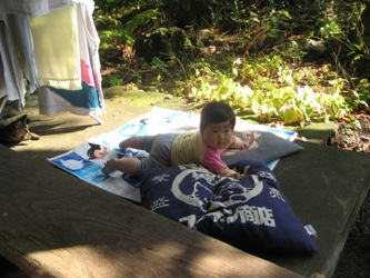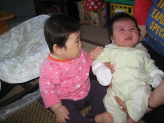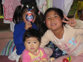 りお姉さんとまお姉さんに昨日は遊んでもらいました!!りお姉さんは小学校2年生、まお姉さんは3歳です。二人ともとっても元気であさひーーと叫んでます。ホントに可愛がってくれています。まおは自分もお姉さんになった感じでした。