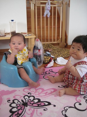 今日は私の後輩のお家に遊びに行ってきました。あすかちゃんデス。あすかちゃんの子供、ルイ君はあさひと同級生。二人仲良くしてくれるかなぁと・・・まずは二人揃っておやつの時間。その後二人で?遊んでいたんだけどグズグズしてきたためゴロンと。そしたらルイ君は寝そうな感じだったけど、あさひが散らしで遊び始めると、ハイハイしてチラシを奪いにきました。やだぁ・・・結局とられて泣いていたあさひでも私のだと引っ張り返して・・・そんな感じに遊んでいたら、ルイ君はもう限界間近・・・今日も楽しく遊んできました!!