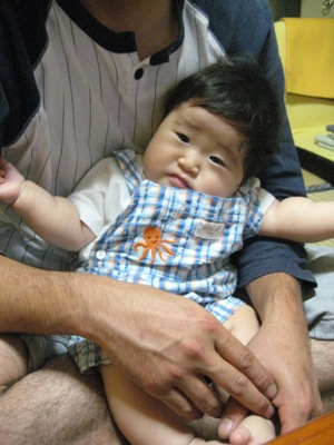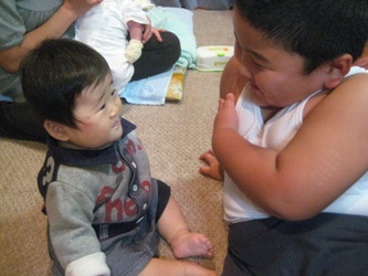 今日はパパのお友達のおうちに行ってきました。そこには8月に男の子が生まれて、2人兄弟がいます。上のお兄さん、リオ君です。リオ兄さんはあさひを抱っこしたりチューしたり、とっても面倒見のいいお兄さんです。弟のシュウト君はミルクを飲んでねんねしていました。リオ兄さんは興奮気味で発狂していました来年にはあさひもきっと発狂しているんだろーなぁ・・・