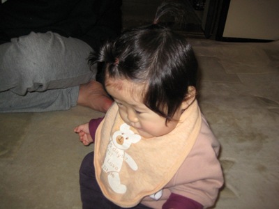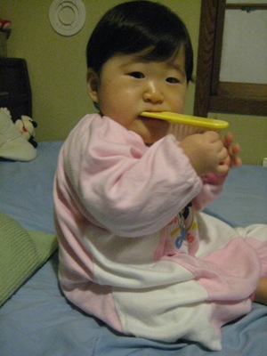 今日はパパが会社?の忘年会の為まだ帰宅しておりません。その為少し遅いのですが先ほどあさひをお風呂に入れました。髪を乾かしたあと、髪をとかしてあげると、くしを取られまして、カミカミ・・・もみ上げを耳に掛けるだけで雰囲気が変わりますね!!女の子だからいじりがいがあります。