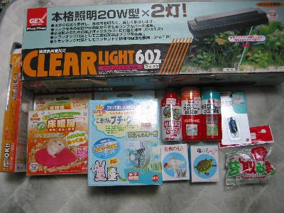 今日はホームセンターで安売りしていたので行ってきました。なんかたくさん安くで売っていたのでついついカゴの中にどんどん入れてしまい・・結局いつも買わない量のものを買ってしまいました。買ったものは・・GEX2灯ライト、200Wサーモスタット付きヒーター、ハムスター用の暖房器具、冷房器具、熱帯魚の薬、苔採るタワシ、餌などなど・・。これから役にたちそうな物は買いました。後で必要じゃなくなったらどうしよう・・。まぁいつか使うものだと思うので良しという事で(^^)