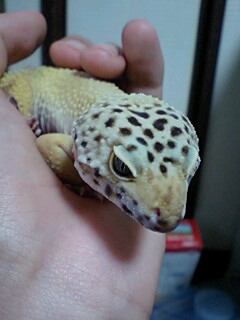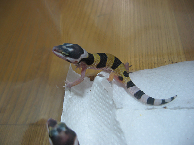 この子は生まれてすぐに片目が開きにくくなってしまいました。※画像はハッチした日です。餌も食べなくなり、本やネットで調べるとどうやら結膜炎のような症状。対策は抗生物質入りの目薬の投与。子供用の目薬を買い、毎日つけてあげました。餌はコオロギの体液を少しずつ舐めさせてあげました。物凄く大変でした。この努力を毎日続けた結果、両目とも開くなるようになって今は元気にしてます! 模様も違います。色から見てハイイエローですね。食欲もあって他の子に負けないです。3ヶ月経ってるのですが拒食していた分、まだまだ小さいですけど・・。はじめてのベビーでかなり動揺もしましたよ(>