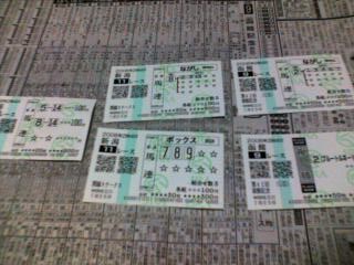 昨日。ウインズ立川で一勝負。新潟6R予想 ◎14スマートエッジ○8ダイワカーメル▲5フレアキャスケード買い目 複勝14 @200 馬連14-5,8 @100結果 1着 9 2着 14 3着 15 複勝110円x2的中。新潟11R 関越ステークス予想 ◎8ナムラモンスター○7シンメイレグルス▲9マイネルモルゲン △2オースミヘネシー△3オーガストバイオ△13ワンダーハヤブサ買い目 馬連BOX 7-8-9 @100 馬連流し 8-2,3,13結果 1着 3 2着 13 3着 9 はずれ。。函館9R 函館記念予想 ◎2ブルートルネード○3エリモハリアー▲6ストーミーカフェ △1タガノデンジャラス△4エアシェイディ△7マヤノライジン買い目 複勝 2 @500 馬連 2-1,3,4,6,7 @100結果 1着 3 2着 4 3着 7 はずれ。。収支 -1,780円。とほほ。。。