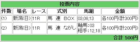 ◎3ニシノナースコール○8サンレイジャスパー▲13ヤマニンメルベイユ△12オースミグラスワン△18スウィフトカレント買い目は 馬連BOX 3-8-13 流し 3-12,18 @100サマー2000シリーズ最終戦!だそうで。スウィフトカレントが有終の美を飾れるかどうかが注目なんでしょうが、、な~んかメイショウカイドウとかエリモハリアーみたく、期待してこけちゃいそうな雰囲気を感じるので△まで。”夏は牝馬”の格言を信じて牝馬3頭で勝負!16ヴィータローザと5トップガンジョーも気になるけど、、、。札幌12R。フジテレビの競馬番組「うまっち」で注目してるシャチョマンユウキが走るそうで。複勝買おうかと思ったけど、2番人気じゃなぁ。。とりあえず見るだけに。