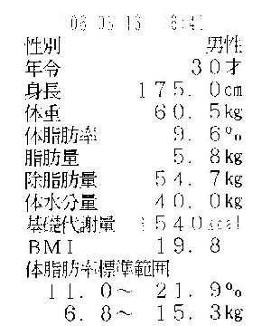 そういえば帰省中。某所で体脂肪計のっかってきまして。出てきたプリントがこれ。体脂肪率9.6%ってのはどうなんでしょう。。。?たしか標準体重って身長-110だったような。とすると私の標準体重は175-110で65kg。3食ちゃんと食ってるけどいっこうに筋肉付く感じでなく。コンビニ弁当ばっかりじゃやっぱり偏ってるんだろうなぁ。(-_-;)