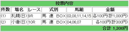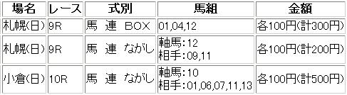 どっちもはずれ。。ワイドにしとけばよかったかなぁ。。。(T_T)札幌記念1着 11アドマイヤムーン2着 7レクレドール3着 8マチカネキララ小倉日経オープン1着 5ツルマルヨカニセ2着 1アルビレオ3着 7ブラックタイド
