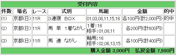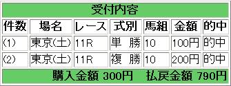 当たったけど、なんか複雑。まさかカワカミプリンセス1着から降着なんて。。(・_・;)1着 15フサイチパンドラ2着 8スイープトウショウ3着 11ディアデラノビア1着→12着降着 16カワカミプリンセス